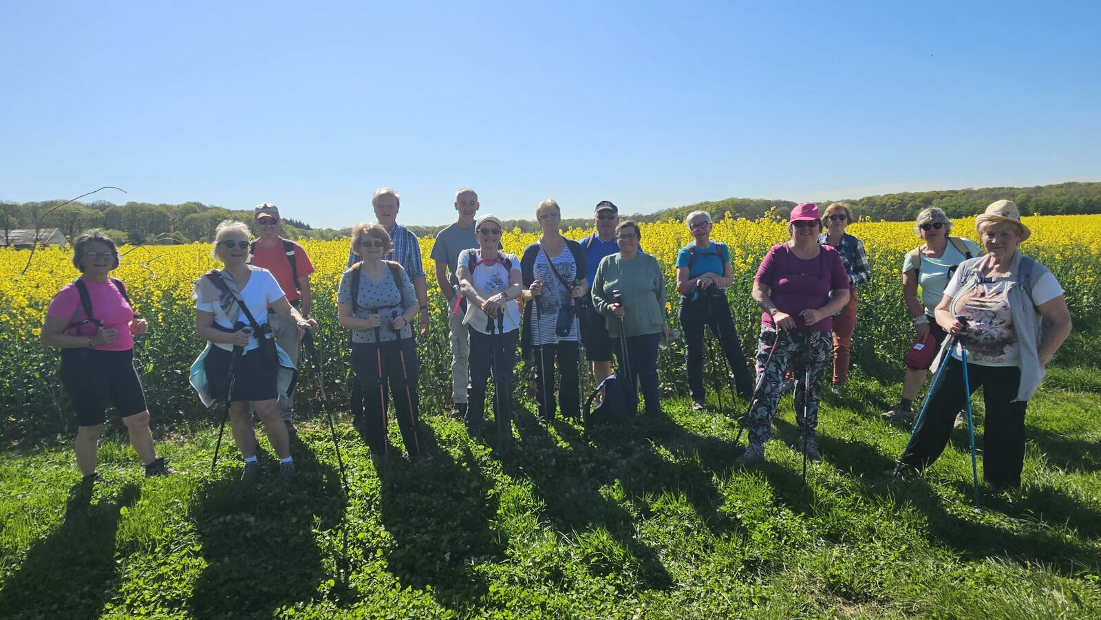 16 marcheurs étaient au rendez-vous de la randonnée organisée par Armelle et Françoise au départ de Mézières en Vexin pour un parcours de 11 km intitulé "François 1er". Cet itinéraire proposé par l'office du tourisme Nouvelle Normandie de Vernon partait de l'église en direction du bois de Mézières pour atteindre la route François 1er que celui-ci empruntait pour aller à la chasse. Après cette première partie tout en descente, arrivait la difficulté du jour: une belle grimpette de 100m de dénivelé positif sur une courte distance, ce qui demandait quelques efforts pour certains participants ; les efforts furent récompensés par une belle seconde partie sous les grand pins du plateau de Notre-Dame de l'Isle. Le chemin continuait jusqu'au hameau de Corville et ses magnifiques champs de colza, une petite montée du bois le Guiletot en apercevant la Ferme Pompadour et un chemin menant à la croix aux Prussiens avant de rejoindre le hameau de Surcy et ses ruelles puis bifurquer enfin sur le chemin rejoignant le parking de l'église du Mezières. Cette belle journée ensoleillée se terminait par le traditionnel goûter offert par Sandrine.
